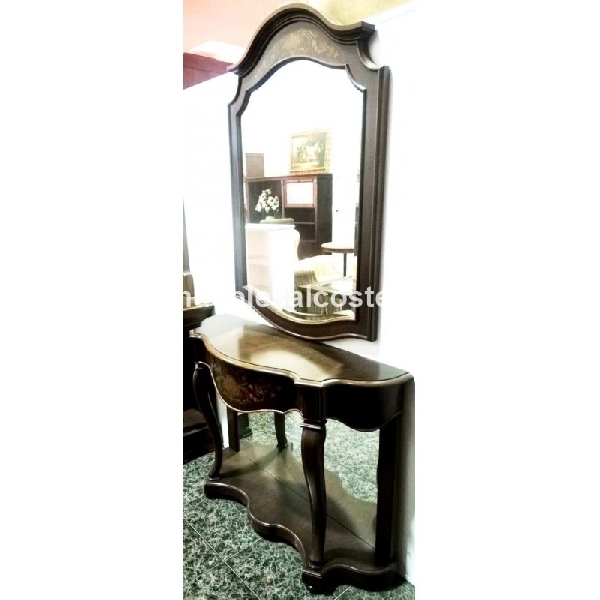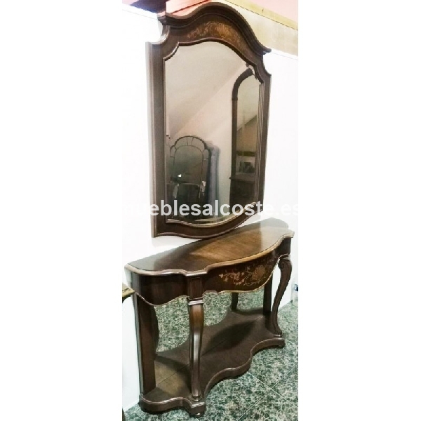 CONSOLA NOGAL CON ESPEJO , MEDIDAS 110 X 32 X 80, MARCO CON ESPEJO MEDIDAS 80 X 113, BARNIZADO SATINADO CON DETALLES DE MARQUETERIAS