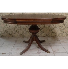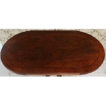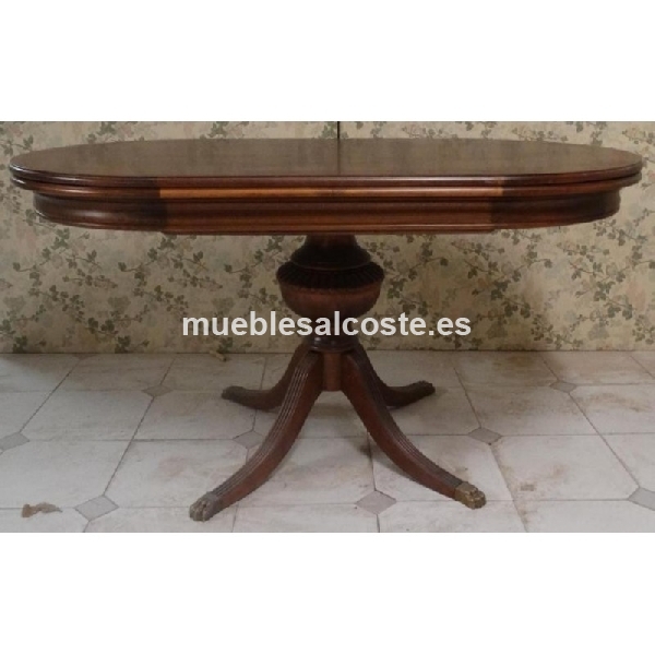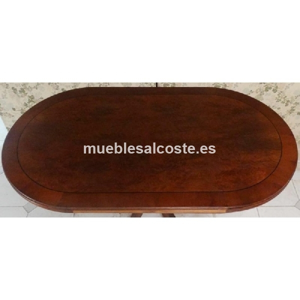 MESA OVALADA RAIZ EXTENSIBLE 140 X 80 CERRADA, ABIERTA 232 X 90 CON 1 COLUMNA CENTRAL TAPA DE RAIZ FAJEADO, AUXILIARES EN MADERA DE CEREZO TEÑIDO, BARNIZADO SATINADO, LIQUIDACION